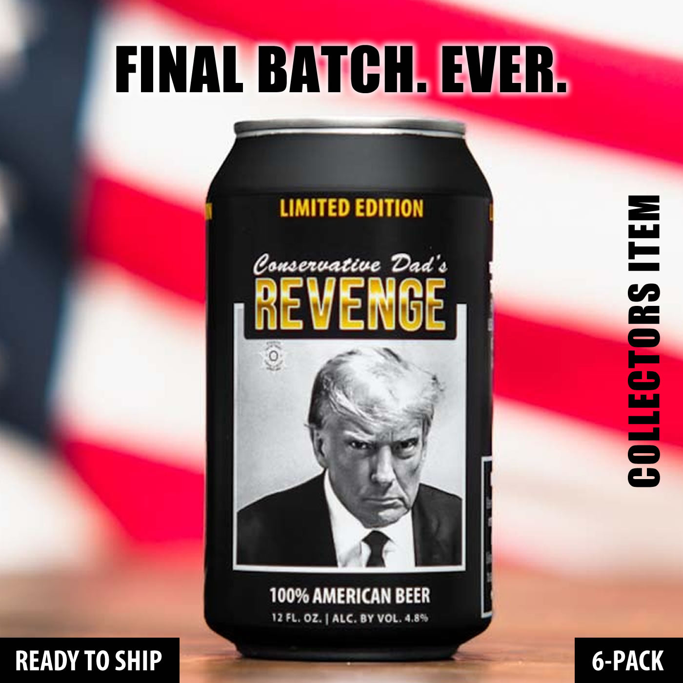 It wasn't until the previous vendor changed ownership that we were notified of the remaining can inventory. We knew what we had to do. We immediately got to work filling these cans, and now we're offering them to you: the final batch of Conservative Dad's Revenge, the Trump Mugshot Limited Edition beer. This is already one of the most collectible beer cans of all time. This final batch is even more unique. Get yours and own a part of history that will never be forgotten. This is the final batch - these will never be produced again.
